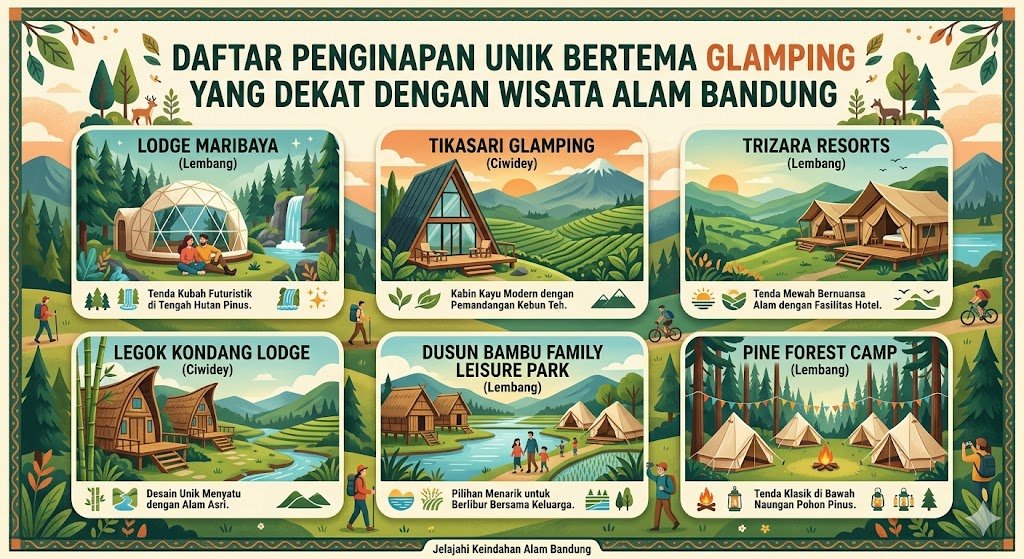 Bandung selalu menjadi destinasi favorit bagi mereka yang ingin melepas penat dari hiruk-pikuk perkotaan. Udara pegunungan yang sejuk serta pemandangan hijau yang membentang luas menjadikan kota ini tempat yang sempurna untuk beristirahat. Salah satu tren menginap yang tengah naik daun adalah glamour camping atau glamping. Konsep ini menawarkan pengalaman menyatu dengan alam tanpa harus mengorbankan kenyamanan fasilitas hotel berbintang, sehingga sangat cocok bagi keluarga maupun pasangan yang ingin menikmati suasana luar ruangan dengan cara yang lebih praktis.